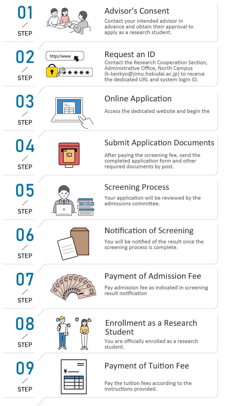 Then, contact the Research Cooperation Section, Administrative Office, North Campus Area Joint Administration Hokkaido University (k-kenkyo[at]jimu.hokudai.ac.jp) to receive the following: