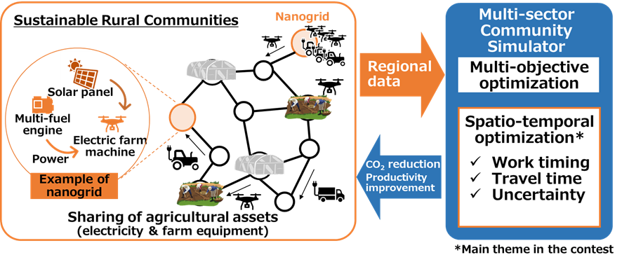 Hitachi Hokkaido Lab. and Hokkaido University are developing an agricultural asset sharing platform to help decarbonize and improve productivity in the agricultural sector by sharing agricultural assets such as electricity and farm machinery to ensure sustainability in rural communities (Fig. 1). We have been developing local promotion for local consumption, and self-supporting regional energy systems based on small-scale, self-supporting nanogrids that utilize renewable energy as the basic unit. The multi-sector community simulator aims to estimate specific investment development effects by simulating the entire community that encompasses this system. The evaluation of the feasibility of an efficient agricultural asset sharing platform, which is the subject of this contest, is an important positioning for the realization of Hitachi Hokudai Lab’s vision of a symbiotic community through a virtuous cycle of health, industry, and energy.