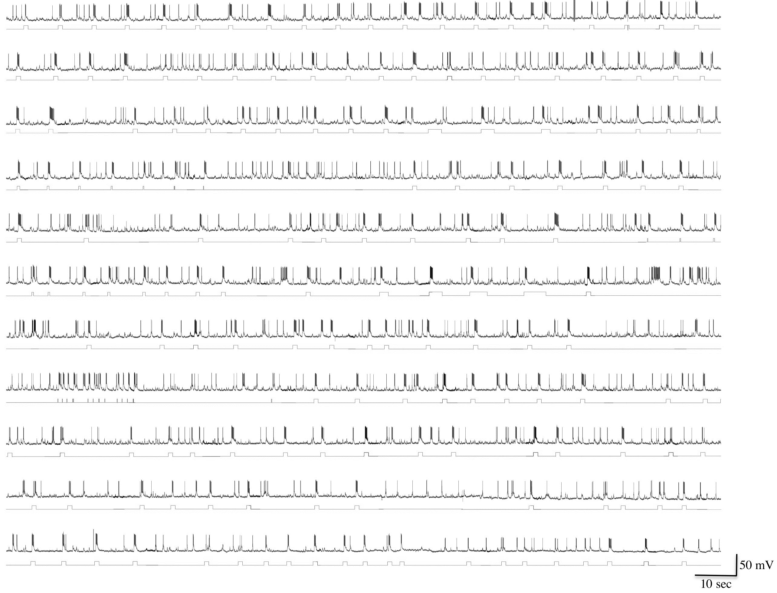 図2.抑制性ニューロン単一の細胞内記録。下のトレースは匂い刺激。(クリックで拡大)