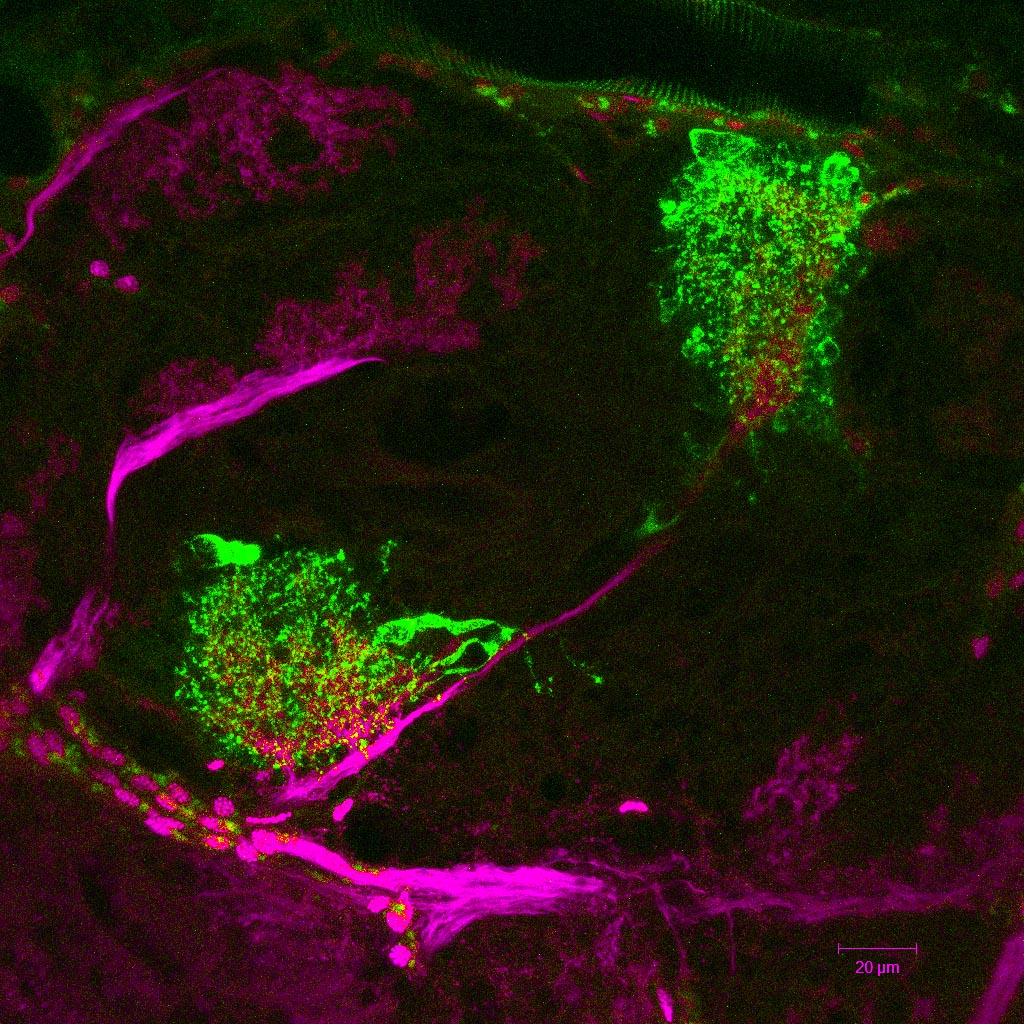 図1.ゴキブリ触覚葉内の、冷受容(DC1)、温受容(DC2)、乾受容(DC3)糸球体
