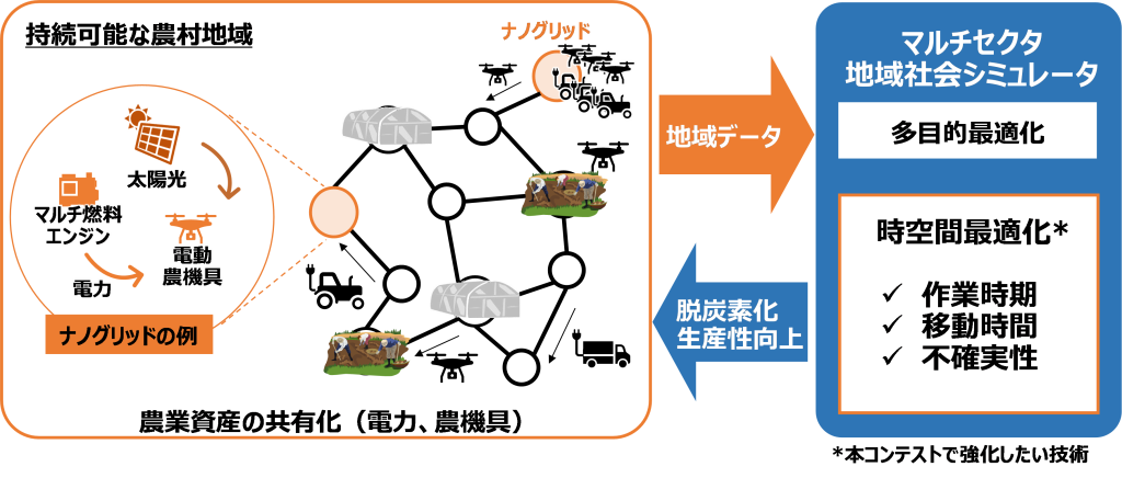 日立北大ラボと北海道大学は、農村地域の持続性確保に向けて、電力、農機などの農業資産共有によって農業分野の脱炭素化・生産性向上に寄与するため、農業資産シェアリングプラットフォームの開発を進めています(図1)。これまでも、再生可能エネルギーを活用した小規模な自立型ナノグリッドを基本単位とした地産地消・自立型地域エネルギーシステムの開発を進めてきました。マルチセクタ地域社会シミュレータは本システムを包含する地域社会全体のシミュレーションにより、具体的な投資開発効果の推定を目的としています。その中で、本コンテストの主題となる農業資産シェアリングプラットフォームの効率化による実現性の評価は、日立北大ラボが考える健康・産業・エネルギーの好循環による共生のまちづくりの実現に向けて、重要な位置付けとなります。