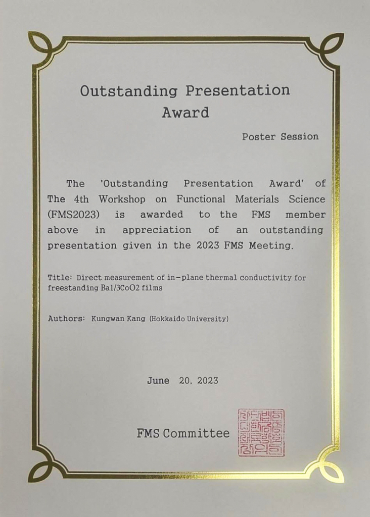薄膜機能材料研究分野のKungwan Kangさん(情報科学院博士課程1年)が、The 4th Workshop on Functional Materials Science (FMS2023) Outstanding Presentation Awardを受賞しました。本賞は、The 4th Workshop on Functional Materials Science (FMS2023)において、特に優れたポスター発表に対して授与されるものです。