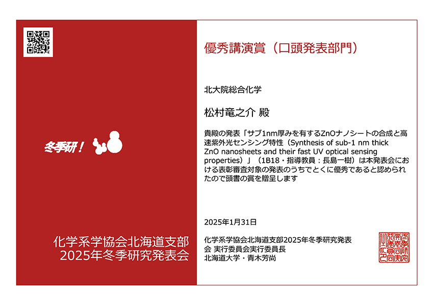 インタラクション機能材料研究分野の松村竜之介さん(総合化学院修士課程1年、指導教員:長島一樹 教授)が化学系学協会北海道支部2025年冬季研究発表会にて優秀講演賞(口頭発表部門)を受賞しました。