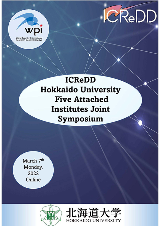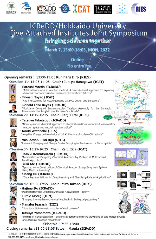 3月7日(月)13:00 – 18:05にICReDD主催、北大5附置研(電子科学研究所、触媒科学研究所、遺伝子病制御研究所、低温科学研究所、人獣共通感染症国際共同研究所)共催でICReDD北大附置研合同シンポジウム(オンライン)が開催されます。奮ってご参加いただければ幸いです。