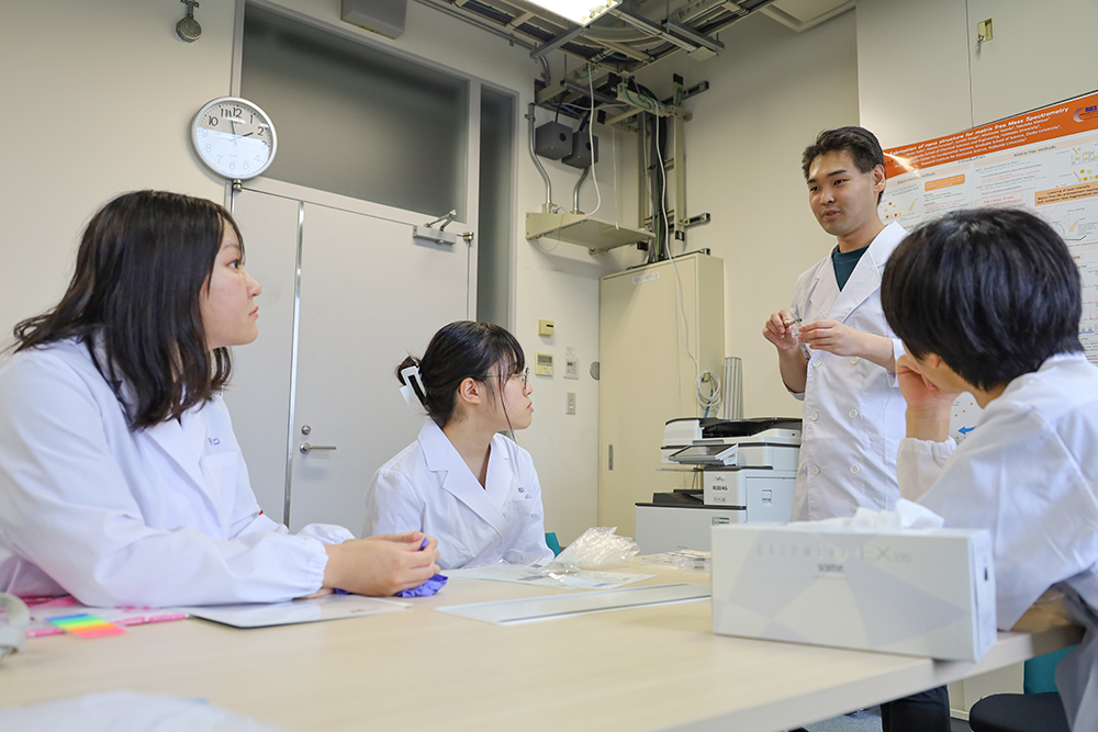光電子ナノ材料研究室にて、講師を務めた博士後期課程2年 辻岡一眞さん(右から二人目)の話に耳を傾ける高校生たち
