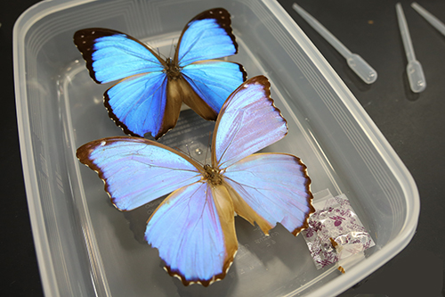 (左上)モルフォ蝶の標本(右上)(左下)辻岡さんの指導に沿って、微細構造を製作する高校生たち(右下)完成した、構造色を示す微細構造をシリコーン樹脂で再現したもの。樹脂の中心部が微細構造になっていて、その部分のみ光に透かすと変色して見える。