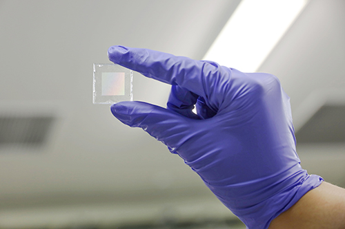 自分たちでつくった微細構造を手に笑顔の高校生たち。左は光電子ナノ材料研究分野 遠堂敬史特任助教
