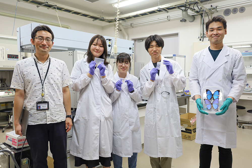「不思議なはたらきをする生物表面~模倣構造を作って知る生き物のすごさ~」と題した光電子ナノ材料研究分野のプログラムには、3名の高校生が参加しました。当研究分野では、「バイオミメティクス」と呼ばれる、生物の持つ優れた機能や構造を真似て新しい材料に応用する研究をしています。体験入学では、モルフォ蝶の翅(はね)の表面構造を題材に実験を行いました。モルフォ蝶の鮮やかな青色は、色素によるものではなく、翅表面の特殊な形状によってつくり出されています。このような微細な構造で生じる色を構造色といいます。さらに、モルフォ蝶の翅には、雨などを弾くため撥水性も備わっています。実際に、こうした特徴的な構造を模倣し、化学染料不要で色落ちの心配のない繊維や、優れた撥水性により内側に食品が付着しにくいヨーグルトの蓋などもつくられています。