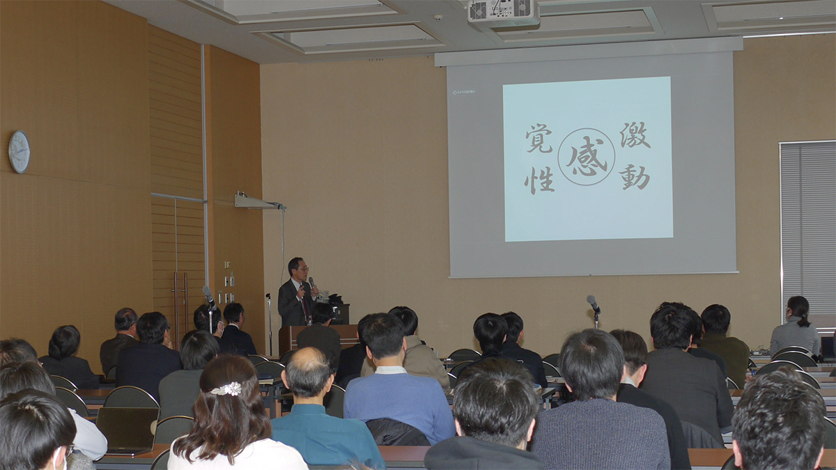 (左)最終講義をする笹木教授(右)サブタイトル「感」について語る笹木教授