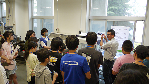 北海道大学の技術職員が担当している仕事は、モノづくり以外にも研究林の維持管理や分析装置のオペレーター、実験動物の飼育管理、広報や安全管理など様々な種類があること、学生の良き先輩、研究者の良きパートナーとして研究や教育を支えるためには対話が重要で、サイエンスツアーのような地域や社会とのコミュニケーションも大切な仕事だと説明しました。 参加者からは、「マザーマシンからマザーマシンを作れる?」「超臨界流体生成装置は何に使うの?」などの質問があがりました。