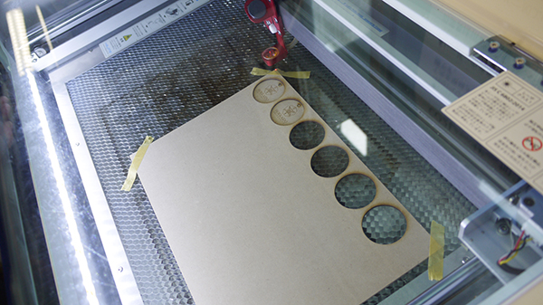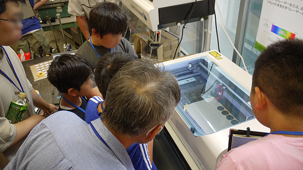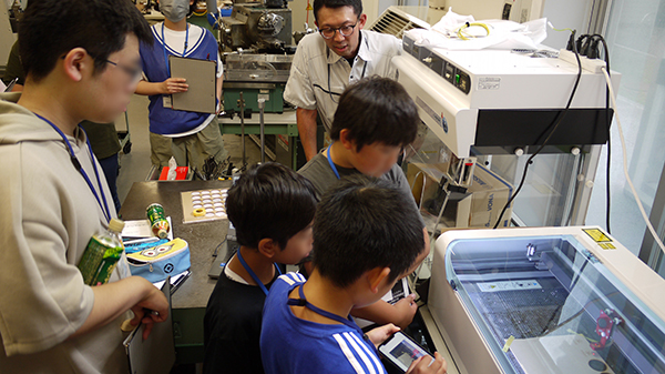 技術職員の仕事紹介の後は、レーザー加工装置の前に集まり実際のモノづくりを見学しました。参加者たちは、加工中の匂いに驚いたり、のぞき込んで装置の動きを観察したり、写真を撮ったりと思い思いに「技術」を体験しました。